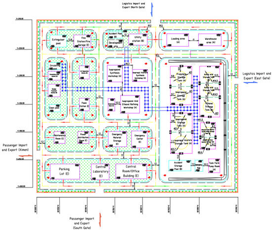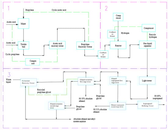 An IPA plant at Sinopec Zhenhai Refining & Chemical Co., Ltd., in the Zhenhai District of Ningbo, China, was simulated via ASPEN v12. The main raw material was propylene, one of the by-products of a related ethylene company project. An annual plant capacity of 80,000 tons of ultra-pure, electronic-grade IPA was specified, produced (along with 51,000 tons of anhydrous ethanol annually) via esterification with acetic acid, subsequent hydrogenation and double-effect distillation. The resulting IPA has a purity of ~99.99%, while the anhydrous ethanol has a >99.5% purity. The technologies behind the processes were upgraded in accordance with “Made in China 2025 (MIC2025)” green development targets [33,34]. Due to its location on one of the company’s reserved development sites, the IPA plant simulation benefits from the following: favourable geography, support from local policies, a plentiful supply of raw materials, and well-developed infrastructure (e.g., transportation network). Figure 2 illustrates the process flow diagram, with the entire process simulation in Figure 3 and the plant layout in Figure 4.