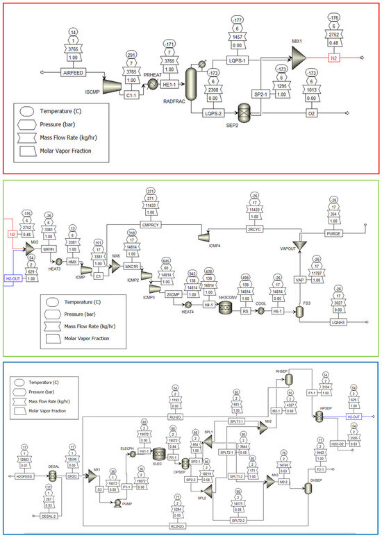 A small-scale, modular green NH3 production case study was simulated via the Peng–Robinson (PENG–ROB) in ASPEN Plus v12.0. PENG-ROB is one of the most popular property methods for NH3 production, primarily due to its high reliability and applicability to various system types. This includes (relatively) non-ideal systems, in contrast to the Soave–Redlich–Kwong equation [35]. The standard 3:1 ratio between H2 and N2 was decided for reaction, R-1, to synthesise liquid ammonia. The flowsheet model for clean, modular NH3 production (Figure 5) via hydrolysis can be divided into three ‘modules’, all developed by [36]: gaseous hydrogen generation via the desalinisation of seawater coupled with Polymer Electrolyte Membrane (PEM) electrolysis (blue), gaseous nitrogen production via air separation unit (ASU) that utilises a cryogenic distillation process (red), and NH3 synthesis (green).