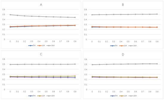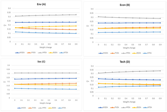 Ci+ results relative to changes in technical (A; top-left), economic (B; top-right), environmental (C; bottom-left), and social (D; bottom-right) criterion weights for IPA pathways.
