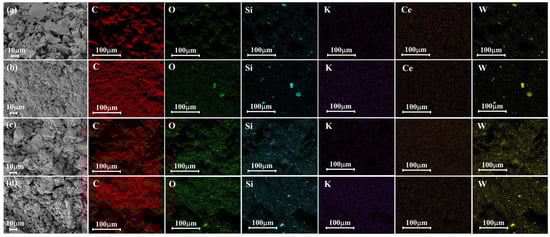 | Catalysts | C (wt.%) | O (wt.%) | Si (wt.%) | K (wt.%) | Ce (wt.%) | W (wt.%) |