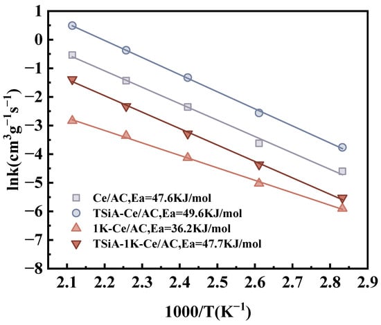 3.3. TSiA-Ce/AC Catalyst Anti-K Poisoning Kinetics Results