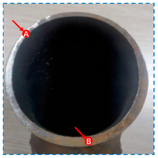 During field inspection of the gas–liquid two-phase flow signal tube in the power plant’s high-pressure heater, significant erosion was observed at the pipe bend. Figure 2 shows the cross-sectional view of the pipe bend with two key points marked as A and B. According to the measurement data in Table 2, wall thickness varies significantly between different locations: the maximum thickness is 6.3 mm (Point 6), while the minimum thickness is only 1.6 mm (Point 7), with other measurement points ranging from 2.2 mm to 6.2 mm. These data indicate that the outer side of the pipe bend (Point A) has experienced more severe erosion compared to the inner side (Point B), resulting in significant wall thinning.