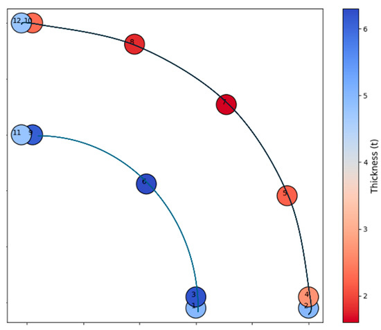 Figure 3 further illustrates the distribution map of wall thickness measurements, using color coding to visually represent thickness variations, where red areas indicate thinner walls and blue areas indicate thicker walls. The 12 thickness measurement points were distributed symmetrically along the inner and outer arcs of the bend to capture differences in corrosion thinning between high-velocity and low-velocity flow zones. At the pipe bend, changes in fluid flow direction led to non-uniform velocity distribution. Due to centrifugal forces acting on the fluid along the curved path, flow velocities are generally higher on the outer side compared to the inner side. These higher velocities result in significantly increased shear stress on the outer side, leading to more severe erosion.