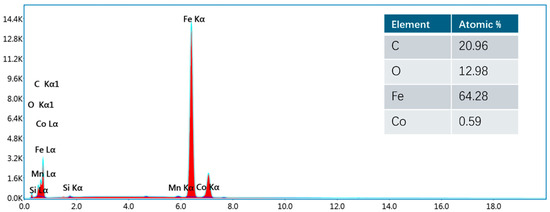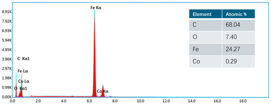 Comparing the EDS spectra in Figure 6 and Figure 7, the impact of corrosion on elemental composition is evident. The high carbon content in the uncorroded metal substrate suggests it might be high-carbon steel or a special alloy. The increased iron content and elevated oxygen levels in the corrosion products indicate the formation of iron oxides; the reduced carbon content suggests carbon combining with iron to form carbides. Although the cobalt content is low, its slight increase in the corrosion products may be due to either alloy composition changes or selective dissolution during corrosion.