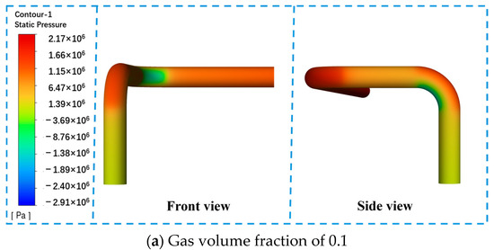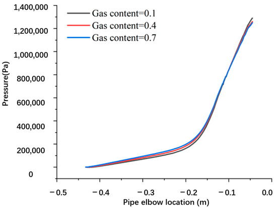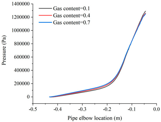 Pressure values were extracted along the centerline of the pipe bend’s outer side and plotted, as shown in Figure 9. As gas content increases, pressure at the pipe bend also increases. This indicates that gas content significantly influences pressure distribution at the bend. All curves show a sharp rise near the bend’s highest point, indicating a rapid pressure increase in this region. This is likely due to centrifugal forces acting on the fluid as it flows through the bend. Furthermore, higher gas content leads to faster pressure increases, particularly when approaching the bend. This may be due to higher gas content causing more bubbles or gas accumulation at the bend, resulting in increased turbulence and pressure losses.