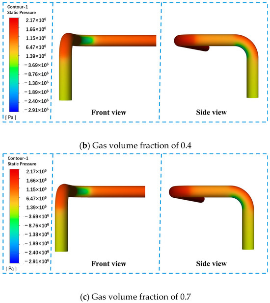 Figure 8 shows the static pressure distribution of gas–liquid two-phase flow in the pipe at gas volume fractions of 0.1, 0.4, and 0.7. Each subfigure includes front and side views to clearly demonstrate pressure variations across both the pipe cross-section and length. At a 0.1 gas fraction, as shown in Figure 8a, the static pressure distribution is relatively uniform, with pressure values primarily ranging between 1.15 × 106 Pa and 1.66 × 106 Pa. Both front and side views show higher pressure on the pipe’s outer side and lower pressure on the inner side, indicating centrifugal force effects at the pipe bend. As the gas fraction increases to 0.4, as shown in Figure 8b, pressure distribution becomes less uniform. High-pressure regions (red) become more pronounced at the pipe bend, indicating increased flow instability due to gas phase presence. Although the overall pressure range remains between 1.15 × 106 Pa and 1.66 × 106 Pa, the high-pressure region area expands. When gas fraction further increases to 0.7, as shown in Figure 8c, pressure distribution becomes significantly non-uniform, with high-pressure regions more concentrated at the pipe bend. This indicates that under high gas fraction conditions, the dominant gas phase leads to significant flow instability, potentially causing larger pressure fluctuations and flow separation phenomena. As the gas fraction increases, the static pressure distribution transitions from uniform to non-uniform, especially in the pipe bend region. This phenomenon primarily results from increased flow instability due to higher gas phase proportions, affecting pressure distribution uniformity.