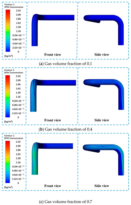 Figure 10 shows the DPM concentration of gas–liquid two-phase flow in the pipe at gas volume fractions of 0.1, 0.4, and 0.7. Each subfigure includes front and side views to clearly demonstrate DPM concentration variations across both the pipe cross-section and length. At a 0.1 gas fraction, as shown in Figure 10a, the DPM concentration is relatively low, with most regions showing blue and green colors, indicating a low DPM concentration. This suggests fewer bubbles in the fluid, weaker turbulent effects, uniform DPM distribution, and minimal local droplet or particle deposition. As the gas fraction increases to 0.4, as shown in Figure 10b, the DPM concentration significantly increases at the bend, with colors gradually shifting to green, indicating a notable concentration elevation at the bend. This may result from decreased fluid density due to an increased gas fraction and enhanced turbulent effects from bubble breakup at the bend, leading to more droplet or particle deposition. When the gas fraction further increases to 0.7, as shown in Figure 10c, the DPM concentration rises significantly, with most regions showing red, indicating a very high DPM concentration. This phenomenon can be attributed to stronger turbulence and secondary flow effects caused by high bubble concentration, promoting more droplet or particle accumulation and deposition. With an increasing gas fraction, DPM concentration at the bend increases significantly. This indicates that bubble breakup and enhanced turbulence at the bend result in higher DPM concentration in this region, leading to more droplet or particle deposition on pipe walls, potentially accelerating the corrosion process.