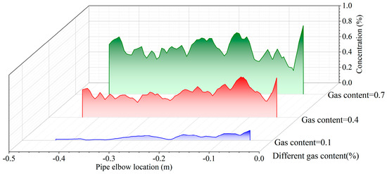 The DPM concentration values were extracted along the centerline of the pipe bend’s outer side and plotted as curves showing the DPM concentration distribution at different gas fractions, as shown in Figure 11. The x-axis represents the z-coordinate values of the bend, while the y-axis shows the DPM concentration distribution along the bend’s outer wall. The graph demonstrates DPM concentration variations at different gas contents (0.1, 0.4, and 0.7). As the gas content increases, the DPM concentration shows a clear upward trend. Specifically, at 0.1 gas content, the DPM concentration remains relatively low, mainly ranging between 0.1% and 0.3% with minimal fluctuations; when the gas content increases to 0.4, the DPM concentration rises significantly, expanding to a range of 0.2% to 0.6%; as the gas content further increases to 0.7, the DPM concentration reaches its peak, fluctuating between 0.4% and 0.8%. This phenomenon indicates that higher gas content not only elevates overall DPM concentration but also intensifies its fluctuations at the bend. This may be due to enhanced turbulence and mixing effects with higher gas content, leading to increased DPM deposition at the bend. The increase in gas content significantly raises the DPM concentration at the bend and amplifies its fluctuations, primarily due to enhanced turbulence and mixing promoting greater DPM deposition.