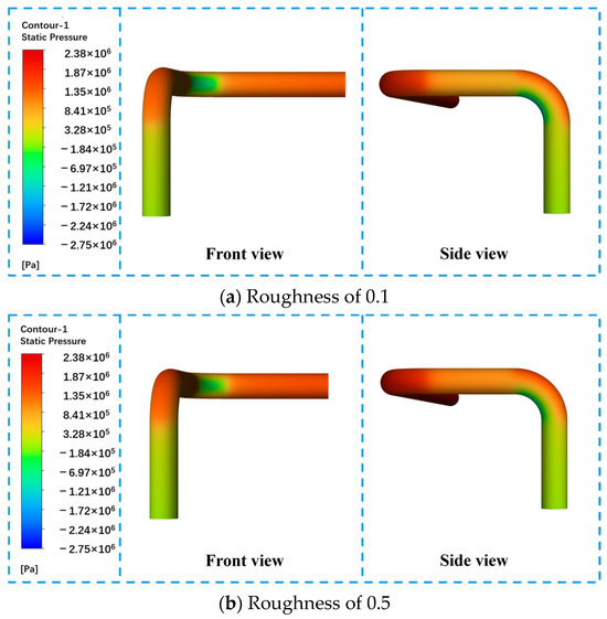 Figure 12 shows the pressure distribution of gas–liquid two-phase flow within the pipe bend at different inner surface roughness values (0.1, 0.5, and 1.0). As roughness increases, pressure distribution transitions from relatively uniform to non-uniform, with significant increases in pressure peaks. Specifically, at 0.1 roughness, pressure distribution is relatively smooth, with colors transitioning from green to yellow; at 0.5 roughness, pressure gradients increase, with some areas showing red, indicating significant pressure elevation; at 1.0 roughness, pressure distribution becomes highly non-uniform, with more red regions indicating increased high-pressure areas. The color legend shows static pressure ranging from −2.75 × 106 Pa to 2.38 × 106 Pa. As roughness increases, maximum pressure values rise from approximately 1.87 × 106 Pa to nearly 2.38 × 106 Pa, while minimum pressure values remain relatively stable. This indicates that increased roughness primarily leads to higher pressure peaks while having a minimal impact on pressure minimums. Physically, increased roughness results in greater friction losses, particularly in the bend’s curved section, potentially causing flow separation and turbulence, thereby affecting overall system performance. Therefore, inner surface roughness is a key factor affecting the pressure distribution of gas–liquid two-phase flow in pipe bends. Optimizing roughness can effectively control pressure losses and flow characteristics, improving pipeline system efficiency and stability.