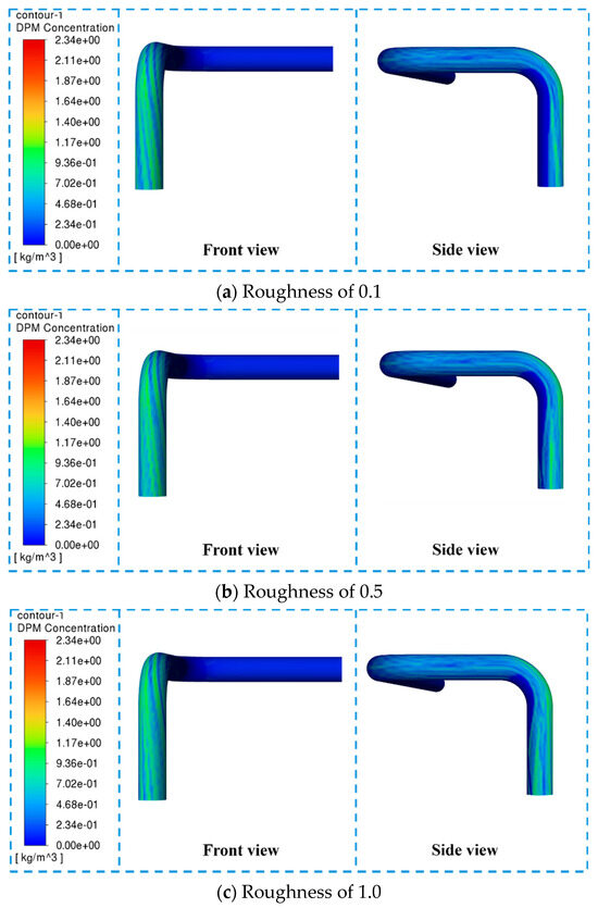 Figure 14 shows the DPM concentration distribution of gas–liquid two-phase flow at different pipe bend inner wall roughness values (0.1, 0.5, 1.0). Through a comparison of the front and side views, it can be clearly observed that as inner wall roughness increases, the DPM concentration rises significantly, especially in the bend region. Specifically, at 0.1 roughness, the DPM concentration is relatively low, primarily showing blue and green colors, indicating smooth flow and weak turbulent effects. When roughness increases to 0.5, DPM concentration increases significantly at the bend, with colors gradually shifting to green and yellow, showing stronger turbulent effects and more droplet or particle deposition. Further increasing roughness to 1.0, the DPM concentration rises further, with more yellow and red regions appearing in the image, indicating a very high DPM concentration and significantly enhanced turbulent effects, leading to more droplet or particle deposition at the bend. This phenomenon is mainly due to increased flow resistance from high roughness, resulting in stronger turbulence and secondary flow effects, thus promoting DPM accumulation and deposition. In conclusion, the increased inner wall roughness of the bend significantly increases DPM concentration, particularly in the bend region, which may exacerbate corrosion and wear issues, posing potential threats to pipeline system safety and stability.