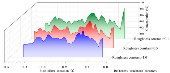 Figure 15 reveals the impact of different pipe bend inner wall roughness values on the DPM concentration in gas–liquid two-phase flow. The figure presents, in three-dimensional form, the variation in DPM concentrations along the bend position under three roughness conditions: 0.1, 0.4, and 0.7. As roughness increases, the DPM concentration rises significantly, particularly in the bend region. Specifically, at 0.1 roughness, the DPM concentration remains relatively low, mainly ranging between 0.1% and 0.3% with minimal fluctuations; at 0.4 roughness, the DPM concentration increases to between 0.2% and 0.6% with larger amplitude fluctuations; at 0.7 roughness, the DPM concentration further rises to between 0.4% and 0.8% with the most significant fluctuations. This phenomenon indicates that higher inner wall roughness not only enhances turbulent effects but also leads to increased droplet or particle deposition at the bend. This is primarily due to high roughness intensifying flow turbulence, especially in flow separation regions, thereby promoting DPM accumulation and deposition. Therefore, bend inner wall roughness has a significant impact on DPM concentration distribution, particularly in the bend region.