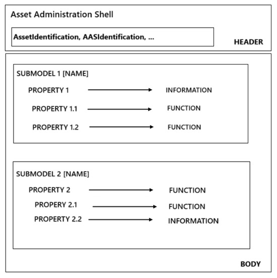 The AAS is composed of two primary components: the information model and the communication protocol. The communication protocol determines how data is transmitted and exchanged, with various technologies being applicable as long as they allow for interoperability between different AAS implementations. The information model of the asset is defined by a metamodel [31], which comprises a header and a body, as illustrated in Figure 1.