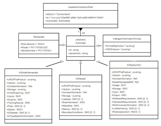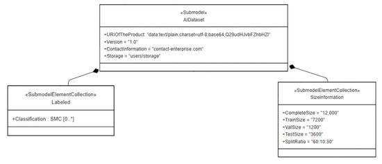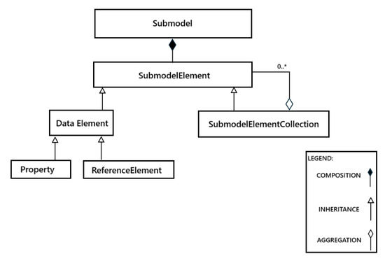 In the AAS metamodel, submodel templates provide a standardized and consistent structure for submodels. A submodel follows the definition specified by the SubmodelTemplate class. These submodels can be tailored to meet specific requirements, allowing for the standard model to be adapted for a particular asset without the need to create a completely new model [32]. The relevant class hierarchy related to a submodel structure is illustrated in Figure 2.