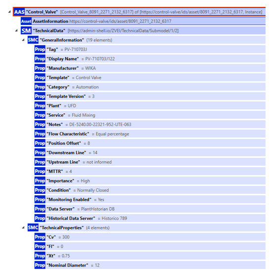 Figure 4 presents a visual representation of the control valve in the AAS Package Explorer [47], a tool used for viewing and editing AAS models. The valve is associated with a Submodel instance named TechnicalData, which includes key properties for its operation and identification within the industrial process.