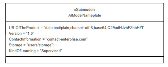 When discussing the AIModelNameplate submodel (Figure 6), in addition to its identification properties (URIOfTheProduct, Version, and ContactInformation, it is important to highlight its Storage and KindOfLearning properties. The Storage property specifies the location of the model file, which can be either a local path, as shown in the fictional example, or a remote server path. The KindOfLearning property describes the machine learning approach applied. In this case, since the task is fault prediction using a classification algorithm, the learning type is supervised, as classification algorithms fall under supervised learning.