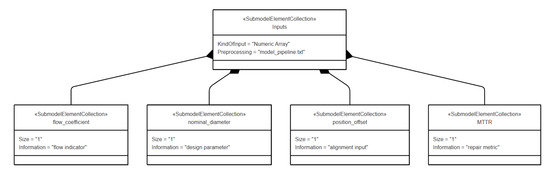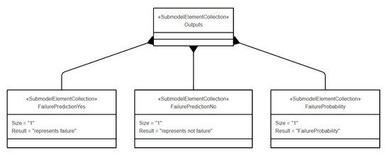 Since the AAS structure was designed to represent a machine learning model, it is essential to highlight both the Input and Output SMCs (Figure 7 and Figure 8). Within the Inputs, the property KindOfInput specifies the type of input data; for this use case, it is a numeric array composed of double features, since the features are measures. The Preprocessing property refers to the preprocessing pipeline, which is provided as an external file. In this case, it is linked to a file named “model_pipeline”. If no preprocessing is applied or no file is provided, this property remains empty.
