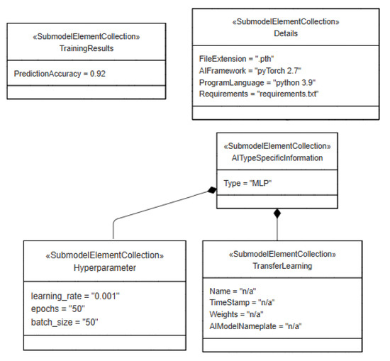 The AITypeSpecification provides details about the classification algorithm used. The property Type specifies the algorithm name, which, in this case, was a Multilayer Perceptron (MLP). The Hyperparameter property lists key algorithm parameters: learning rate = 0.001; epochs = 50; and batch_size = 50. The TransferLearning SubmodelElementCollection (SMC) contains information related to transfer learning, if applied. For illustration purposes, its properties were filled with “n/a”. According to the specification, if no transfer learning data is available, the SMC is not required.