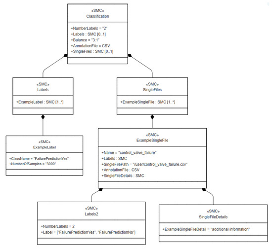 In the Classification SMC (Figure 11), contains metadata and information about the labeled data used in the prediction task, which, in this case, involves the application of a classification algorithm. The property NumberLabels specifies the number of labels considered in the classification problem. According to the specification, a maximum of two labels is allowed, which characterizes the task as a binary classification problem. In such cases, the model predicts between two classes, typically “yes” or “no”, or, equivalently, “1” or “0”, indicating the presence or absence of a specific condition (e.g., a fault). The property Balance indicates the proportion of positive and negative samples in the dataset. In this case, 3000 samples were labeled as fault (positive) and 9000 as no fault (negative), reflecting a class imbalance. The AnnotationFile property describes the format of the dataset file containing the labels. In this case, the dataset was stored in a CSV (Comma-Separated Values) file.