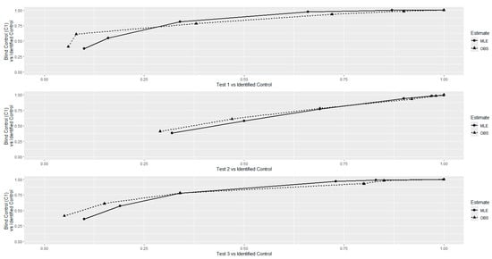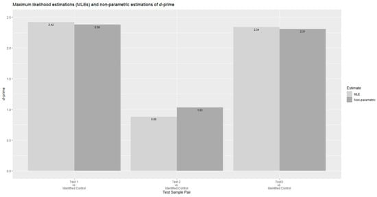 Figure 1 shows the d-prime values, i.e., the estimates of for three test samples vs. the identified control sample estimated by MLEs and nonparametric estimations. MLE and nonparametric estimation generally produce consistent and similar results. MLE is more popular and powerful with smaller estimation errors, while an advantage of nonparametric estimation is that there is no assumption for distributions. However, it is noted that the nonparametric estimation is, in fact, for the AUC. The d-prime is indirectly obtained from the AUC based on an area theorem.