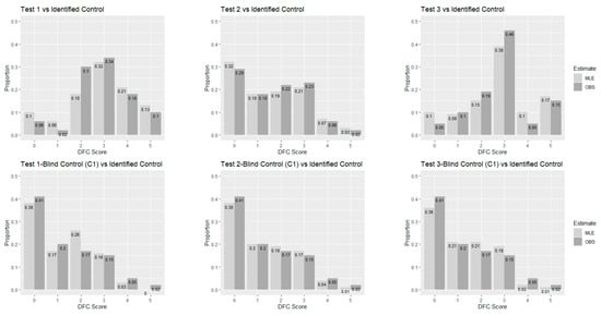 The R code ‘DFCmle0(x)’ can be used to produce predicted probabilities of the DFC categories of Hit (H) and False-alarm (FA) based on the observed proportions or frequencies of the DFC ratings and MLE results. For example, for the rating frequencies of the blind control vs. the identified control in the first column in the data file ‘dfc6’, and for the rating frequencies of test sample 1 vs. the identified control in the second column in the data file ‘dfc6’, the observed proportions of the DFC categories are as below.