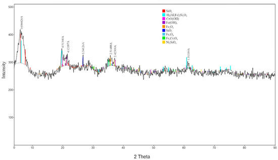 According to the results of the X-ray diffraction analysis conducted using a D8 ADVANCE X-ray diffractometer (BRUKER, Karlsruhe, Germany) (Figure 2), the mineral composition of the low-grade nickel ore is predominantly represented by quartz, nontronite, chromium metahydroxide, goethite, magnetite, and iron chromite. The nickel in the ore was detected in the form of nickel (II) silicate.