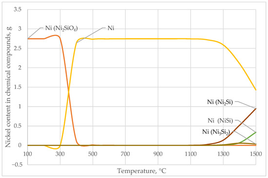 The results of the modeled phase distribution of nickel at various temperatures are presented in Table 2. As the temperature increases, nickel transitions from the oxide phase to the metallic phase and, subsequently, into more stable compounds with silicon.