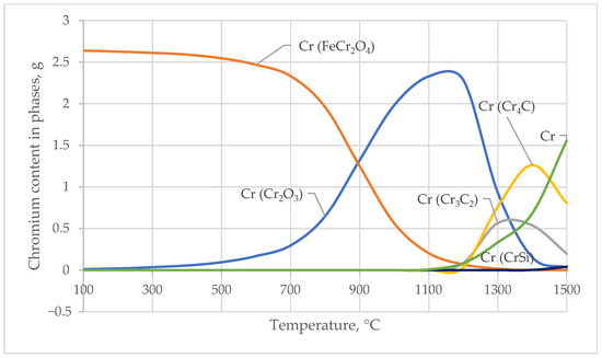 During thermodynamic modeling of the reduction of chromium-containing components in the ore, a stepwise redistribution of chromium among various phases was observed, depending on the temperature (Table 3).