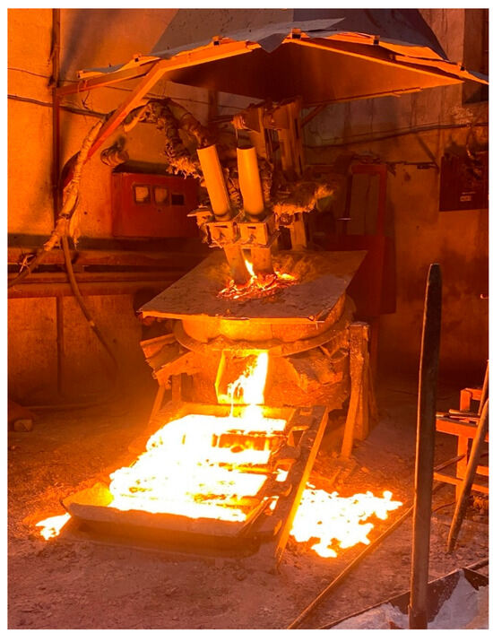 The charge cone around the electrode measured 0.3–0.45 m in height at an angle of 35–40°. The smelting electrical mode was selected to create the necessary thermal conditions in the shaft with deep electrode immersion. The secondary voltage ranged from 18 to 24 V, with an electrode current of 150–200 A (on the primary transformer winding). The charge descended into the reaction zone smoothly and evenly, without collapses. Current load fluctuations were observed 1–1.5 h after tapping, when metal accumulated in the furnace. After tapping (Figure 5), adjusting the burden, and loading a new portion of the charge, the current load stabilized. The charge was evenly heated by the outgoing reaction gases, creating favorable conditions for the progression of reduction processes.