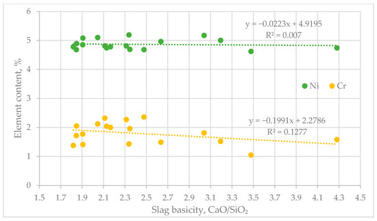 Based on the data presented in Table 4, an analysis was carried out on the effect of slag basicity on the nickel and chromium content in the alloy (Figure 6).