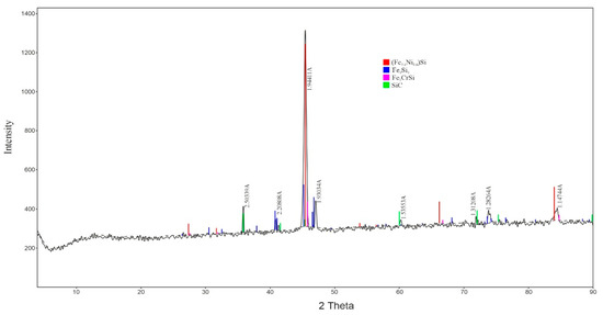 After smelting and tapping, samples of the obtained alloy were collected for subsequent laboratory analysis. To determine the phase composition of the resulting nickel–chromium ferroalloy, an X-ray phase analysis (XRD) was performed (Figure 7). The analysis revealed that the structure of the obtained nickel–chromium ferroalloy consists of a mixture of intermetallic and carbide phases. The main phase identified was the intermetallic compound (Fe2.4Ni0.6)Si, indicating a high degree of alloying with nickel and silicon.