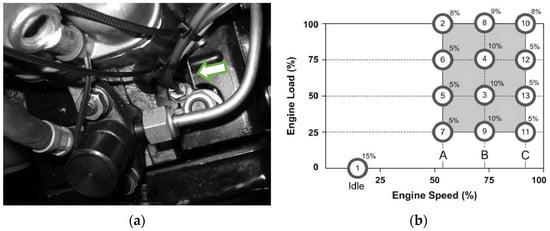 (a) Position of the pressure transducer with cooling tube and wiring in the cylinder head, near fuel injector. (b) Engine operating regimes defined according to the ESC 13-mode test.