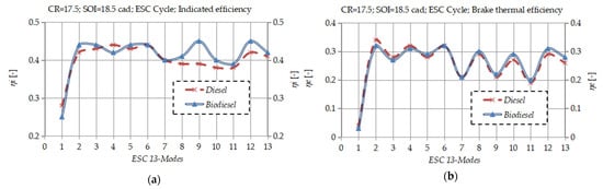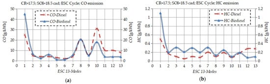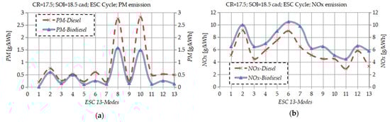 Figure 4. Changes in (a) PM and (b) NOx emission levels under standard ESC 13-mode cycle with diesel and biodiesel fuel and under constant SOI = 18.5 cad BTDC and CR = 17.5:1.
