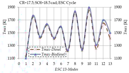 Cylinder pressure indication and emission measurement are implemented at all 13 points (modes) by the ESC 13-mode requirements. In each test mode, the experimental engine operated in defined time intervals: exactly 4 min in the first, and 2 min in all others. Changes and the establishment of stable engine speed and load were realized simultaneously in each mode within the first 20 s (during engine heating). The engine speed was maintained with a prescribed accuracy of ±50 rpm, while the torque value was kept in the interval of ±2% of the maximum torque at the established test speed.