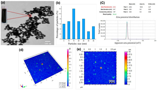 Zeta potential analysis was carried out for confirmation of the stability and surface charge of the synthesized Fe3O4-NPs, as presented in Figure 2c. However, the current study revealed that Fe3O4-NPs are more stable with a zeta potential value of −26 mV. The stability of the nanoparticles was measured at the optimal line between stable and unstable particles, as generally categorized as either higher than −26 mV or lower than −26 mV. The previous study reported that more stable nanoparticles were synthesized with the zeta potential value of −26 mV. As a result, the particle is more stable and has a strong negative surface charge [37]. AFM contour imaging in Figure 2b,c was also conducted for the size, geometry, size distribution, and morphology of the synthesized Fe3O4 NPs. The profiles of Fe3O4-NPs range in height from 10 to 30 nm. The measurement principles of AFM are customized to obtain data that is usually higher than the data of the x, y plane [38]. The acquired results revealed that the particles were spherical in shape and dispersed on the x and y planes. Most of the particles were agglomerated due to the magnetic properties of the nanoparticles.