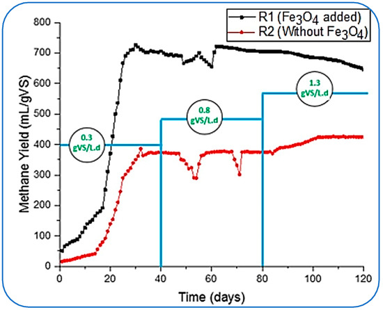 In this study, the same process was followed, and we started loading reactors with the lowest OLR of 0.3 and gradually increased it to 1.3 by adjusting 0.8 gVS/Ld as an intermediate concentration of substrate inside the reactors. During this variation in OLRs, the concentration or the dosage of NPs (Fe3O4) was kept constant for 120 days. The impact of the addition of NPs on CH4 is given in Figure 3. Two reactors, R1 (with the supplementation of Fe3O4-NPs) and R2 (without NP loading), were run simultaneously to investigate the impact of NPs with different OLRs and the activities that took place in the conventional (R2) reactors.