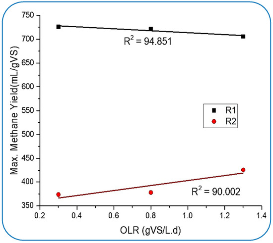 The pH drop was more rapidly recovered in R1 than in R2. Meanwhile, the CH4 yield in both reactors reached the maximum generation. At this stage of stabilized generation after the 30th day, the generation of CH4 in R1 and R2 was in the range of 700 to 725.9 mL/gVS and 361 to 373.3 mL/gVS, respectively. Hence, the pH was at this stage in the range of 6.6 to 7.6 in R1. The pH was also well adjusted in R2, which is required for well-stabilized conditions for any successful digestion, as suggested by [48] and further cited by [43,44]. From Figure 5b, it can be seen that the highest CH4 (725.9 mL/gVS) in R1 was achieved at 0.3 OLR with maximum bioconversion of TVFAs, which were less than 500 mg/L.