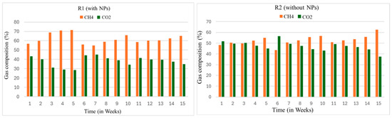 The samples from each reactor were taken once a week. This analysis was carried out right from the first week to the 15th week of the digestion process. In the first week, GC analysis showed that the CH4 content was about 56 and 47% in the R1 and R2 reactors, respectively. The content of methane in the R1 at this stage agreed with the results reported by [49]. Their study cited maximum CH4 content in the whole search, ranging from 57 to 69%. Furthermore, ref. [50] utilized Fe to improve the digestibility of the process. He reported the CH4 content as 60–65%.