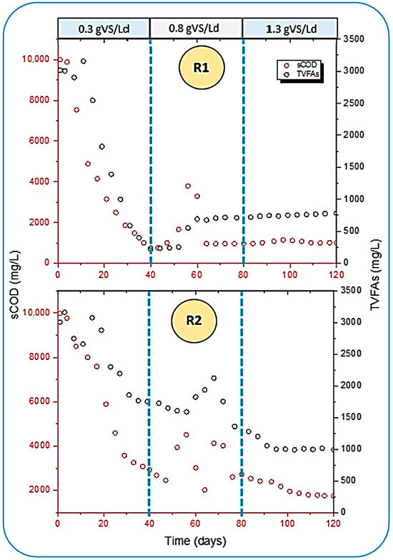 Later on, the OLR was increased from 0.3 to 0.8 gVS/Ld in both reactors after 40 days of digestion, as shown in Figure 7. Unbalanced behavior was observed in the reactors for the removal of sCOD, and the bioconversion of TVFAs became lower. This impact was caused by the accumulation of TVFAs, which were again raised from 215.45 to 549.98 mg/L in R1, and a similarly higher concentration of TVFAs was analyzed in R2 as well. This accumulation caused a drop in pH from greater than 7 to less than 5 in both reactors. It was noted that when the concentration of TVFAs was increased inside the reactors, it hampered the removal of sCOD. The results at this stage were quite in agreement with the observation made by [51].