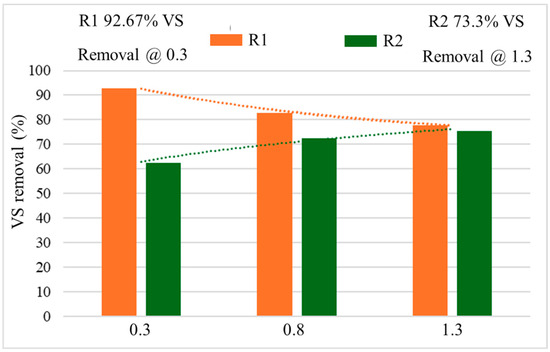 Nevertheless, a slight disturbance was observed in the removal of VS during the middle OLR (0.8 gVS/Ld) due to increased substrate feeding and limited microbial concentration. This impact led to a reduction of more than 90% removal in R1, which was set at 0.3 gVS/Ld OLR and reached around 80% at 0.8 gVS/Ld, as described in Figure 8. Ref. [13] also reported that the OLRs, 0.8 gVS/Ld (which was the lowest OLR) yielded the maximum VS removal of 76% when they found only 63% VS reduction at 2.1 gVS/Ld OLR.