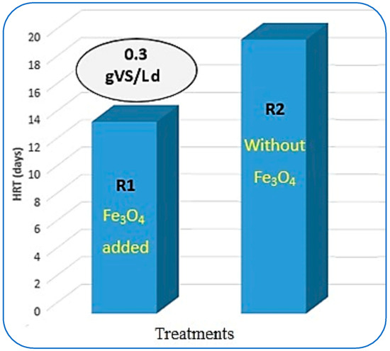 The estimation of hydraulic retention time (HRT) in CSTR-based AD of organic waste plays an important role. This HRT analysis leads to the design of the reactors needed to treat a specific amount of organic waste [40]. From Figure 9, it can be seen that the maximum VS reduction with optimum CH4 yield was achieved at 0.3 gVS/Ld of OLR in R1. More than 90% of VS removal was achieved in 14 days of hydraulic retention time. Whereas R2 took 20 days to biodegrade the same loading rate as the substrate. Somewhere else in the literature, the mesophilic AD of municipal solid waste digestion gave 15 days of HRT when the reactors were loaded up to 15 gVS/Ld [54].