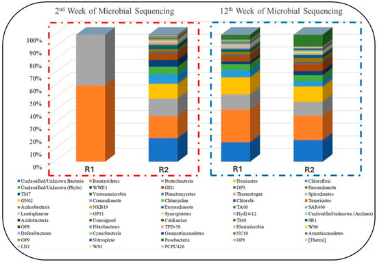 In this study, microbial analysis was carried out at two different stages of anaerobic digestion, such as at weeks 2 and 12 as shown in Figure 10. The analysis results revealed that during the week digestion, the reactors started adopting anaerobic conditions and stabilized. However, in week 12, the results during that the reactors have been stabilized and the impact of NPs on microbial growth is witnessed. Based on the study, shown in Figure 10, the distribution of four significant methane-producing microbes (Proteobacteria, Firmicutes, Bacteroidetes, and Actinobacteria) was totally different in R1 and R2 [58]. These four groups are of major importance in the microbial analysis of any AD process for methane generation. Furthermore, most of the members belonging to the Firmicutes phylum are syntrophic bacteria that can degrade various VFAs [59].