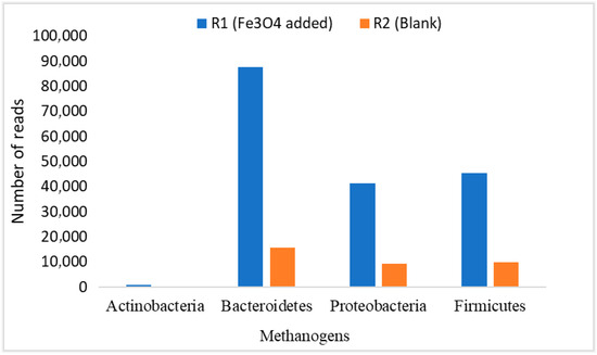 The average relative abundance of these Bacteroidetes, Firmicutes, and Proteobacteria was estimated as 33.85%, 31.36%, and 34.79% of bacteria, respectively [60]. Whereas, in another study, the microbial community in the effluent from digesters was dominated by representatives from the phyla Proteobacteria (77.8%) and Firmicutes (19.5%). In addition, the phyla Actinobacteria and Bacteroidetes were present at lower abundance, 1.5 and 0.6%, respectively [43,44]. Figure 10 shows the number of reads of these microbes in our study. It can be seen in Figure 11 that the three microbial communities (i.e., Bacteroidetes, Firmicutes, and Proteobacteria) significantly increased in R1, to which NPs were added, compared to R2. Their numbers of reads were about 10,000, 45,000, and 41,000, respectively. That is the way R1 yielded better performance in terms of CH4 generation and VS reduction rates. Perhaps, this stabilized performance of R1 might be because of a proper DIET mechanism among the microbes, enhanced enzymatic activation, good resistance against the inhibitory compounds (such as sCOD and TVFAs) and boosted hydrolysis and metabolism [25,42]. Hence, it was observed that the addition of NPs showed biocompatibility during the 120 days of digestion, but their efficiency decreased as OLR increased.
