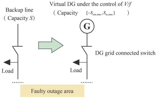 After the power distribution network fault, the two problems of power supply restoration decision-making and island division are coupled with each other, and it is difficult to separate them into independent calculations; otherwise, the global optimal solution will not be obtained. Therefore, in order to simplify the comprehensive optimization problem, this paper first processes the spare contact line with DG equivalence, as shown in Figure 1.