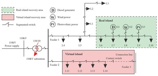 An example of integrated power restoration using contact lines and DG is shown in Figure 2. Suppose a substation fault occurs, and the 10 kV busbar loses power. Feeder 1 can restore power through the independent operation of the internal wind, photovoltaic, and gas turbines, and Feeder 2 can close the contact switch with the external network and restore power through the contact line of Feeder 3. By equating the contact line to the virtual DG shown in Figure 1, the power outage area can be divided into a real island, based on the restoration of the power supply from the DG of the distribution network, and a virtual island, based on the restoration of the power supply from the contact line, which makes the comprehensive optimization problem unified and simplified into a generalized islanding problem, based on the DG.