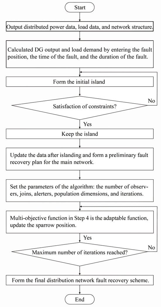 The flowchart of the active distribution network fault recovery scheme based on the chaotic binary sparrow search algorithm is shown in Figure 3, and the steps are as follows: