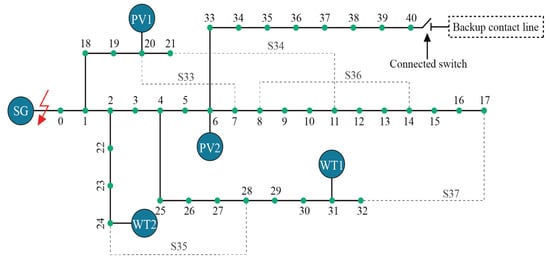However, there are still some limitations to this study. In this paper, the complex solution scenario caused by DG and load uncertainty is considered, but the source load output used in the solution is the actual value at the time of failure, not the predicted value, and does not take into account the “time difference” between the solution time and the action execution time caused by the action execution or instruction issuance. In this paper, the optical or wind storage system formed by energy storage and DG has not been considered, so the fault recovery scheme does not involve these forms of islanding power supply. A fault recovery control strategy that supports a form of joint power supply from the main network and the island will be studied in the future. In this paper, the simulation experiments are carried out on an IEEE40 node network, and the experiments are not carried out on other typical node networks. In further studies, the authors will consider validating this. The authors add this as a limitation of the proposed scheme in this conclusion.