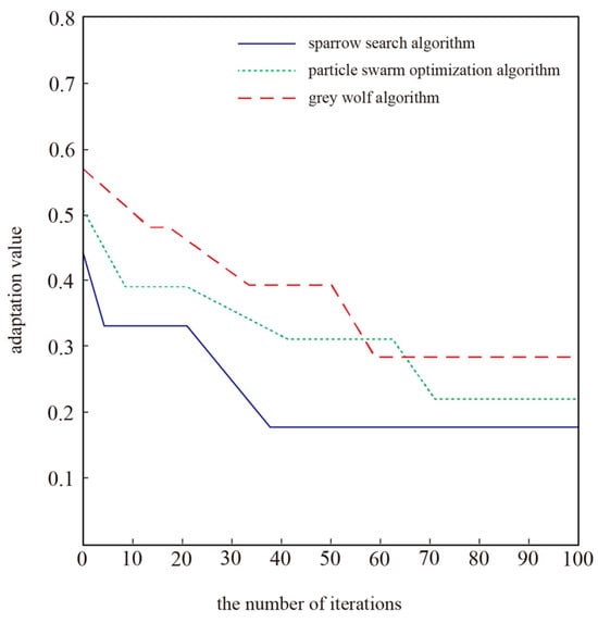 The sparrow search algorithm (SSA) has been applied to many research aspects such as system scheduling [], path planning [], and deep learning [], and has shown strong search ability and high search accuracy in solving mathematical models and can search for the optimal solution of complex functions faster. The SSA has the characteristics of strong optimization ability, fast convergence, high stability, and robustness []. In this algorithm, the behavior of sparrows searching for food can be regarded as the process of finding the optimal solution in a specific range of space, and the goal of sparrow search is to search for the global optimal value in this process.