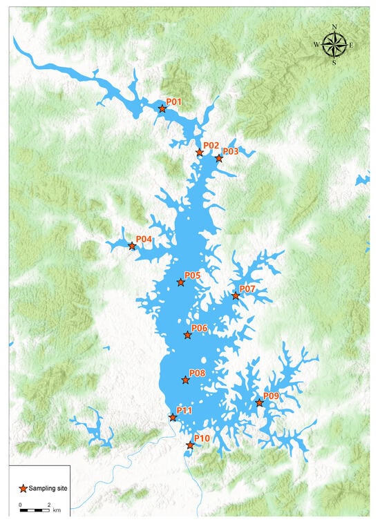 The study reservoir is located in Lianjiang, Zhanjiang, Guangdong Province (21°39′ N, 110°17′ E), in China. It has a total storage capacity of 1.144 billion m3, a maximum water surface area of 122 km2, and a catchment area of 1495 km2. Over the past 60 years, its average annual water yield has been approximately 1.48 billion m3. To ensure representative spatial coverage and sampling efficiency, 11 sampling points were strategically selected across the reservoir. Their distribution is illustrated in Figure 1.