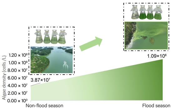 With the rapid development of industrialization and agriculture, excessive inputs of nitrogen and phosphorus have exacerbated eutrophication in aquatic environments. Eutrophication could lead to serious negative ecological effects: for instance, increased microbial biomass, decreased biodiversity, lower efficiency of nutrient use, and accelerated cycles [,]. Recently, lakes in China have experienced various degrees of eutrophic pollution during the rapid anthropogenic development period, leading to a series of problems. Le et al.’s study [] proposed that lake water eutrophication in China has disrupted the drinking water supply. Jin et al. [] demonstrated that the water quality and lake ecosystems are declining, as many lakes in China commonly undergo eutrophication. Wang et al. [] indicated that Lake Wuli in Jiangsu Province, China, has experienced an evidently deteriorating trend due to overexploitation. Reservoirs are characterized by slow flow rates and long hydraulic retention times, usually corresponding to eutrophic status and further leading to water quality deterioration, ecosystem instability, and a high frequency of blue-green algal outbreaks. Qin et al.’s study [] considered that shallow lakes, which are mixed systems without thermal stratification and sediment resuspension, similarly to reservoirs, are commonly related to the loss of control of eutrophication. Jiang et al. [] found that new reservoirs in China covered by villages and farmlands were easily eutrophic with low biodiversity and self-purification capacity. Rocha et al. [] assumed that the reservoirs with low water volume corresponded with a higher nutrient level. Except for abnormal ecological responses, Cyanobacterial blooms are of particular concern, with their potential production of toxins, such as cylindrospermopsin, saxitoxin [], and microcystin [] produced by Cylindrospermopsis and Microcystis, posing severe threats to aquatic ecosystems and human health [,]. With its concentrated distribution in subtropical and tropical areas [,] and sensitivity to growth environment factors [,], there is relatively less research focusing on Cylindrospermopsis compared with Microcystis and other Cyanobacterial algae, and the mechanism of Cylindrospermopsis bloom needs to be further investigated [].