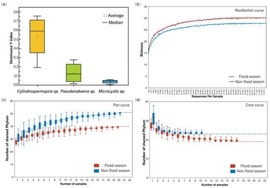 Dominance Y index of 3 species of Cyanobacteria in the reservoir (a), rarefaction curve (b), pan curve (c), and core curve (d) of OTUs.